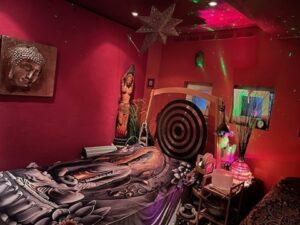 Danach schreiten wir die Treppe zum Tempel hinunter, vorbei an indischen Figuren und Bildern und Du nimmst den Geruch von Weihrauch oder Aromalampe und eine wohlklingende und tiefgreifende Musik wahr, die Dein Herz berührt und die Dich jetzt schon in einen wohligen Zustand bringt.